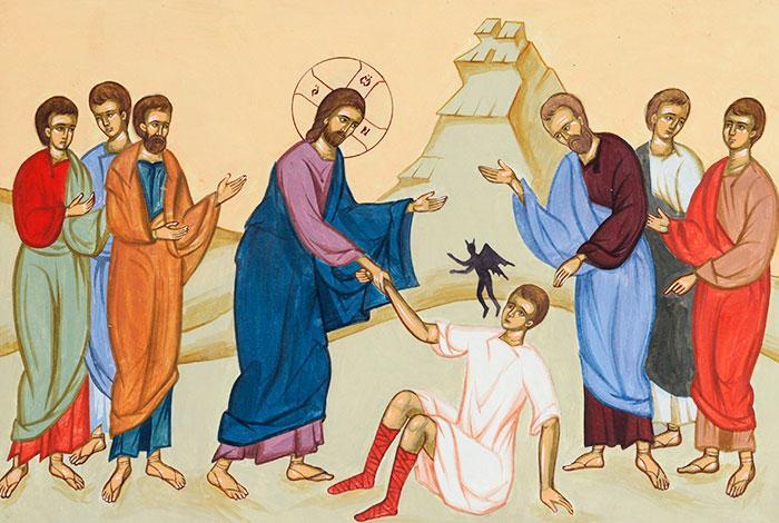 Așa i-a găsit Mântuitorul pe cei din sat, după ce a coborât de pe muntele Tabor. Sfădindu-se. L-a întrebat pe tatăl copilului și acesta I-a spus despre ce este vorba și că ucenicii nu au putut să-l vindece.